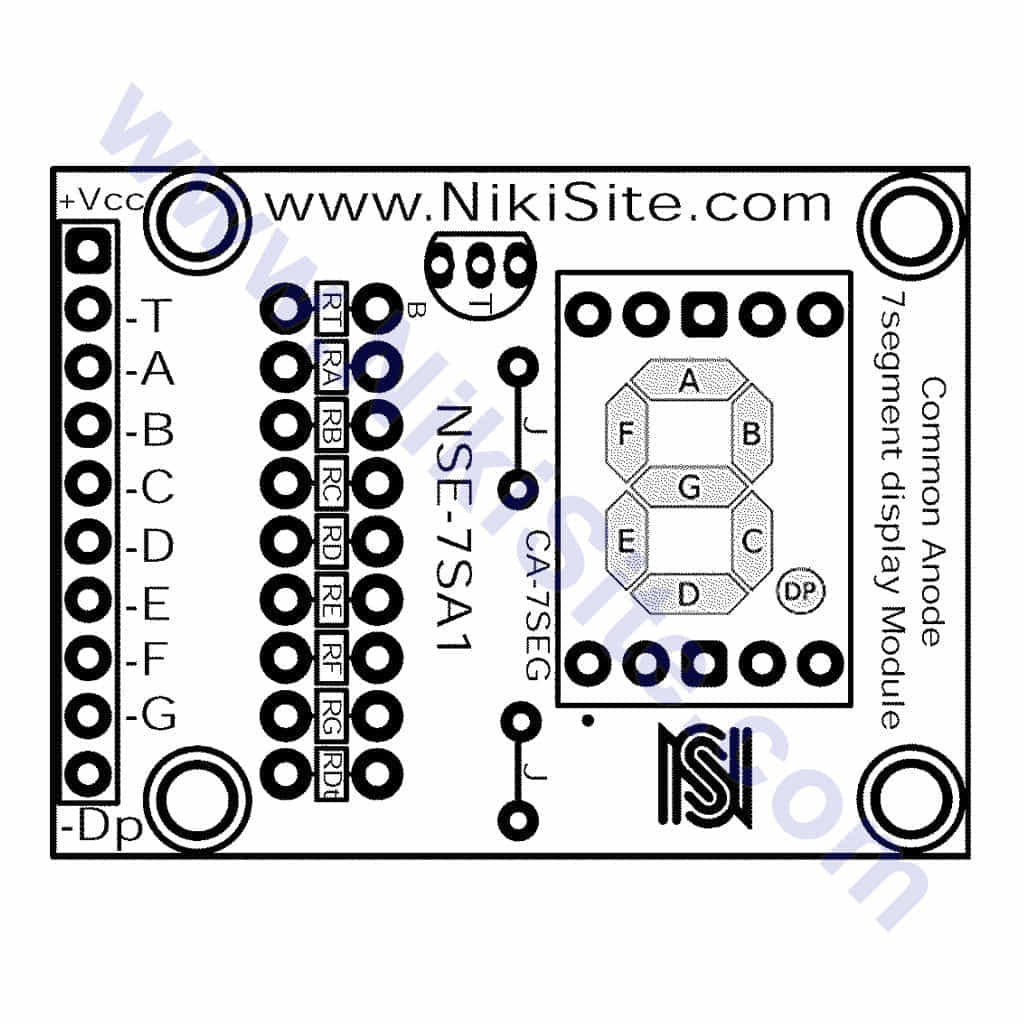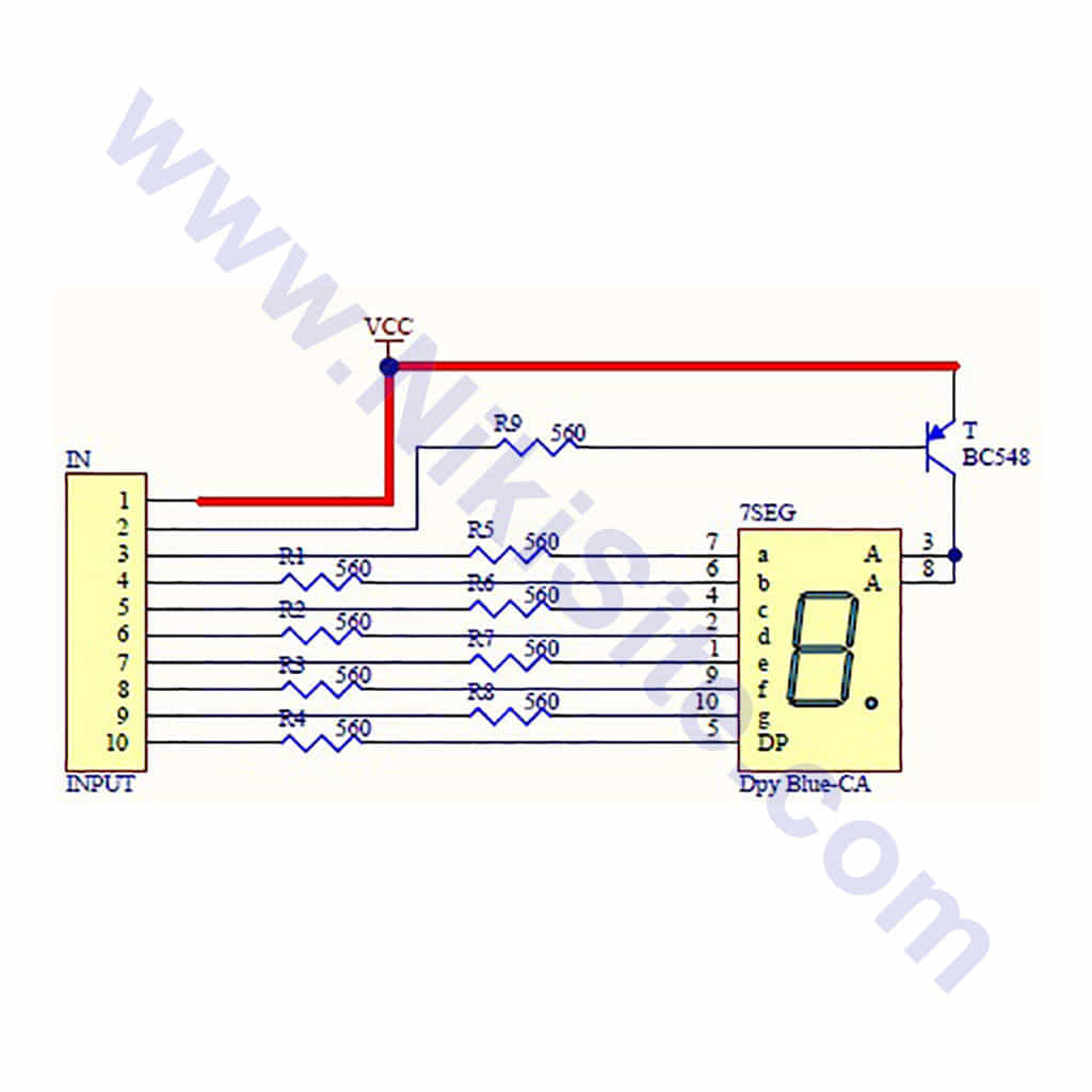 پین 1: Segment E پین 2: Segment D پین 3: Common Anode (برای رقم) پین 4: Segment C پین 5: Decimal Point (DP) پین 6: Segment B پین 7: Segment A پین 8: Common Anode (برای رقم - موازی پین 3) پین 9: Segment F پین 10: Segment G *پین 3 و 8 داخلاً به هم وصل هستند