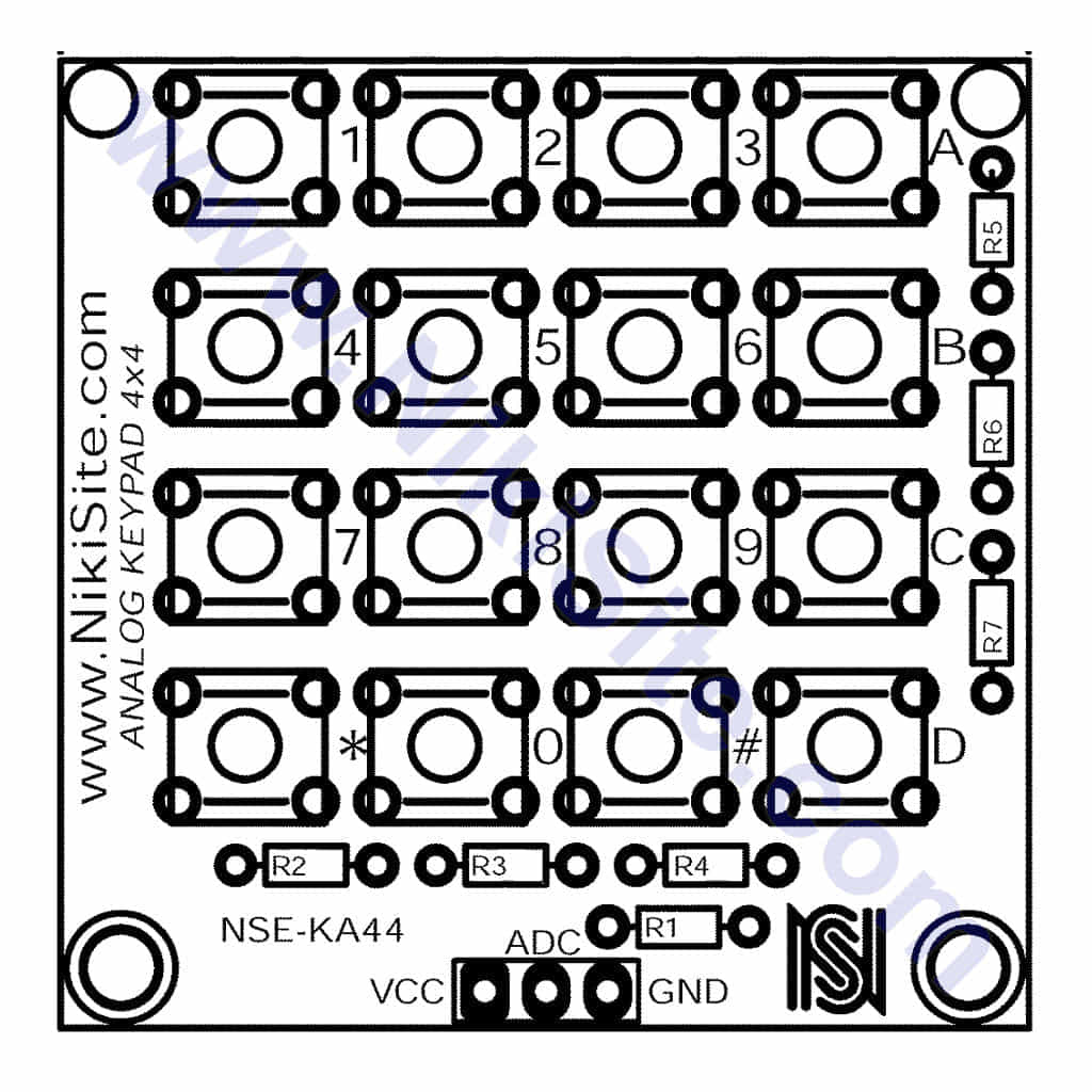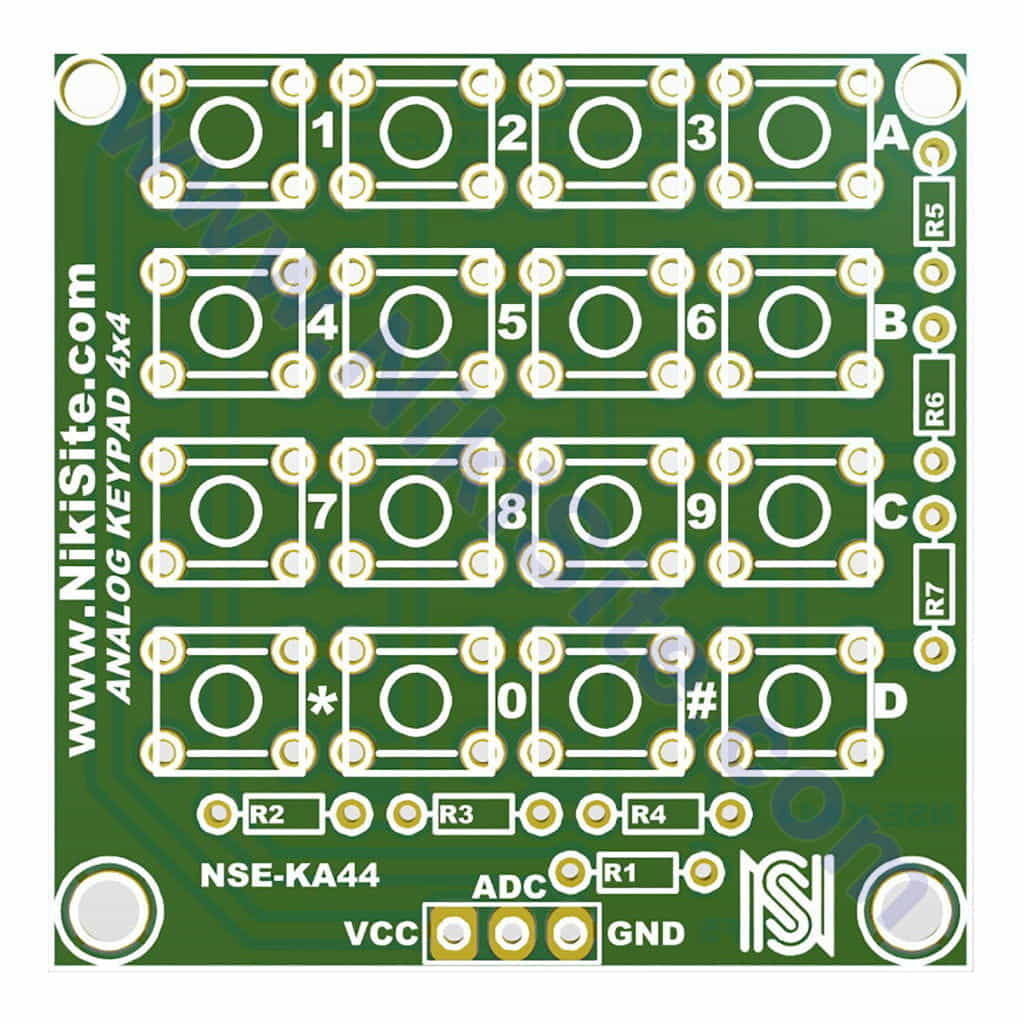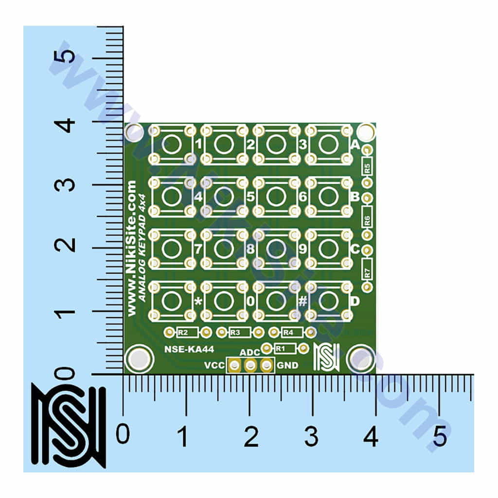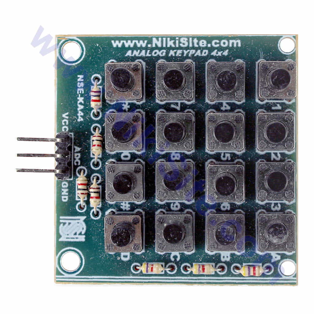 ماژول کیبورد آنالوگ 16 کلیده ، ماژولی کوچک با ظاهری جذاب برای کاربرد در پروژه های شماست. این ماژول با سه پین ، به راحتی با پلتفرم آردوینو و یا هرگونه میکروکنترلر دیگر (MCU) ارتباط برقرار کرده و از اشغال شدن پین های بیشتر جلوگیری نماید. سری های مورد استفاده برای این ماژول قابل تعویض هستند . با فشردن هر دکمه خواهید دید که خروجی هر دکمه ولتاژی متفاوت دارد و این مورد برای MCU قابل تشخیص خواهد بود .