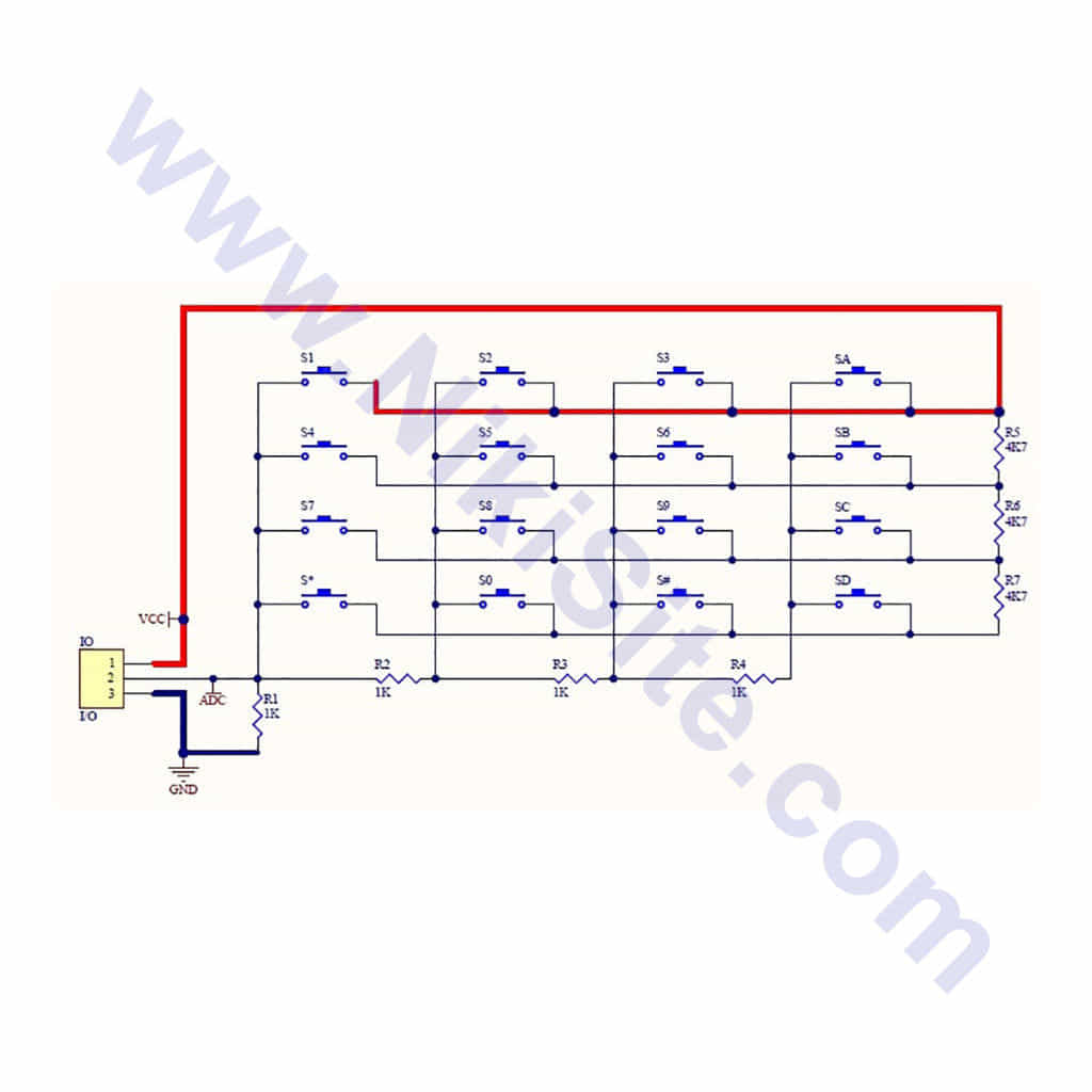 ما می توانیم با استفاده از یک پورت تک بیتی (ADC) یک ماتریس ۴*۴ از کلید ها را به میکرو متصل کنیم.