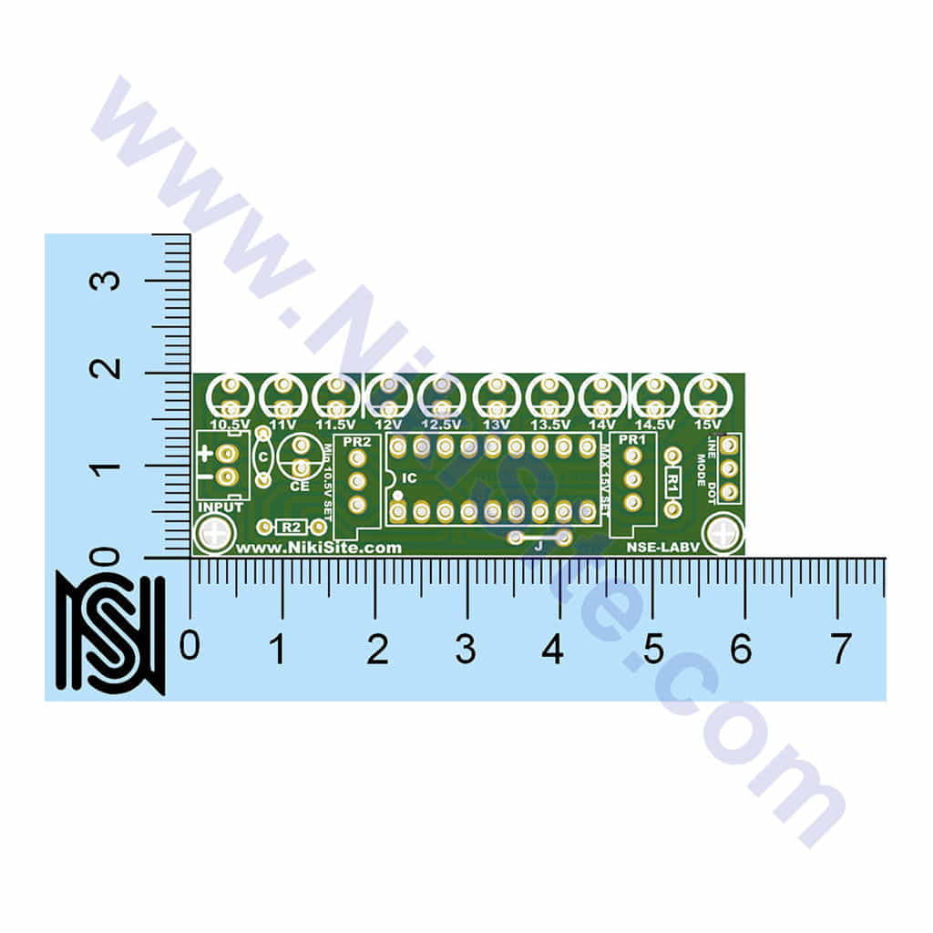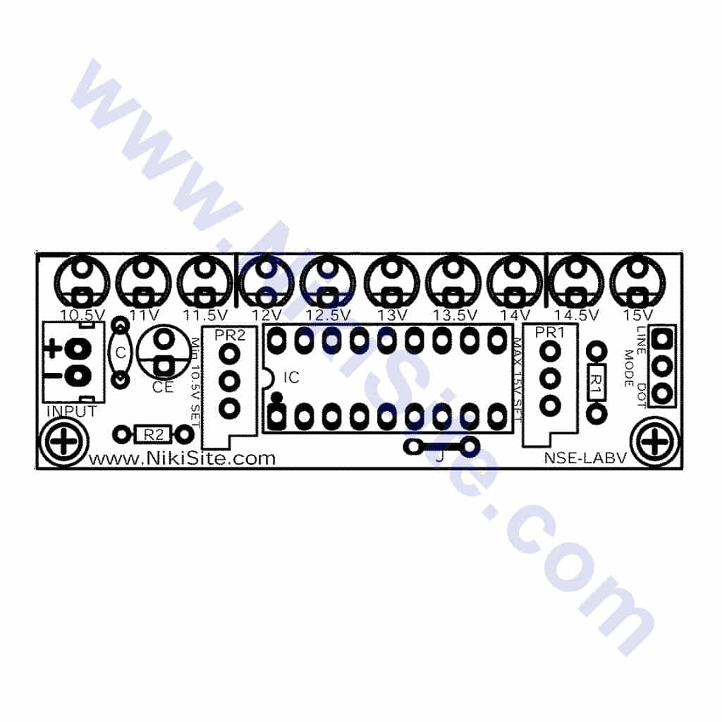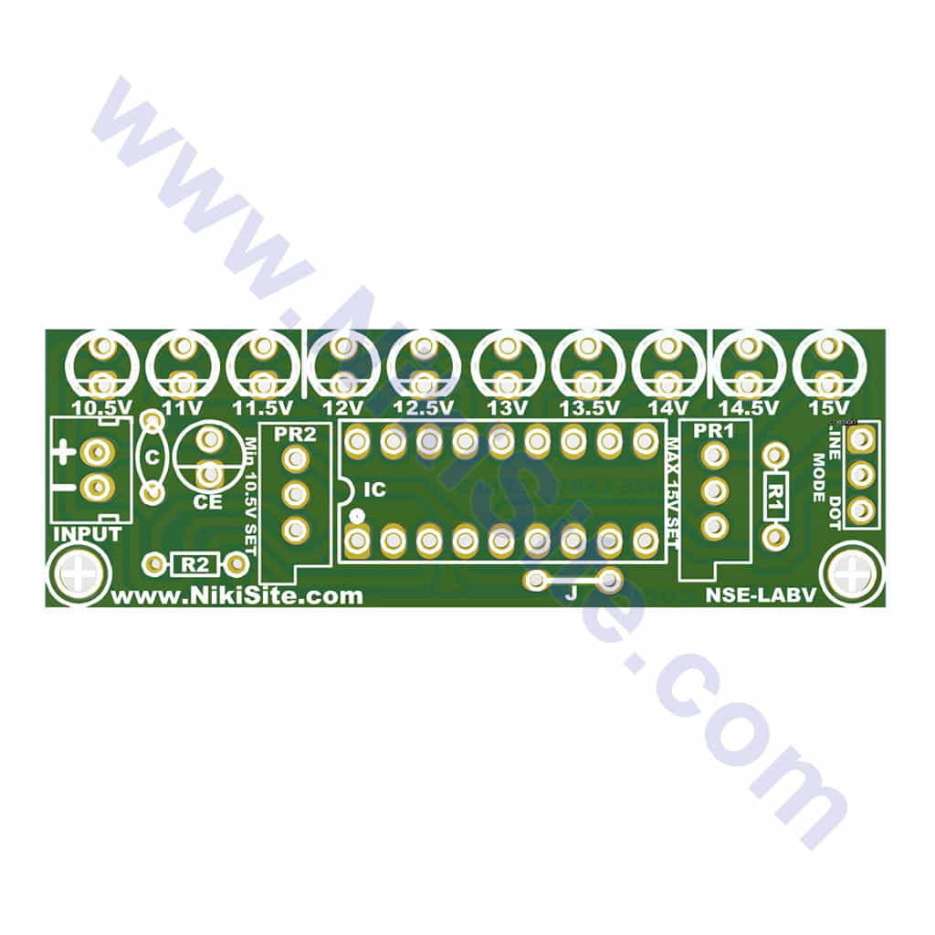 1. **تنظیم حداقل (PR1):** - باتری را به 10.5V تنظیم کنید - PR1 را بچرخانید تا LED 1 روشن شود - PR1 را تنظیم کنید تا LED 1 خاموش شود 2. **تنظیم حداکثر (PR2):** - باتری را به 15.0V تنظیم کنید - PR2 را بچرخانید تا LED 10 روشن شود - PR2 را تنظیم کنید تا LED 10 خاموش شود 3. **تست:** - ولتاژ را از 10.5V تا 15V تغییر دهید - LED ها باید به ترتیب روشن شوند