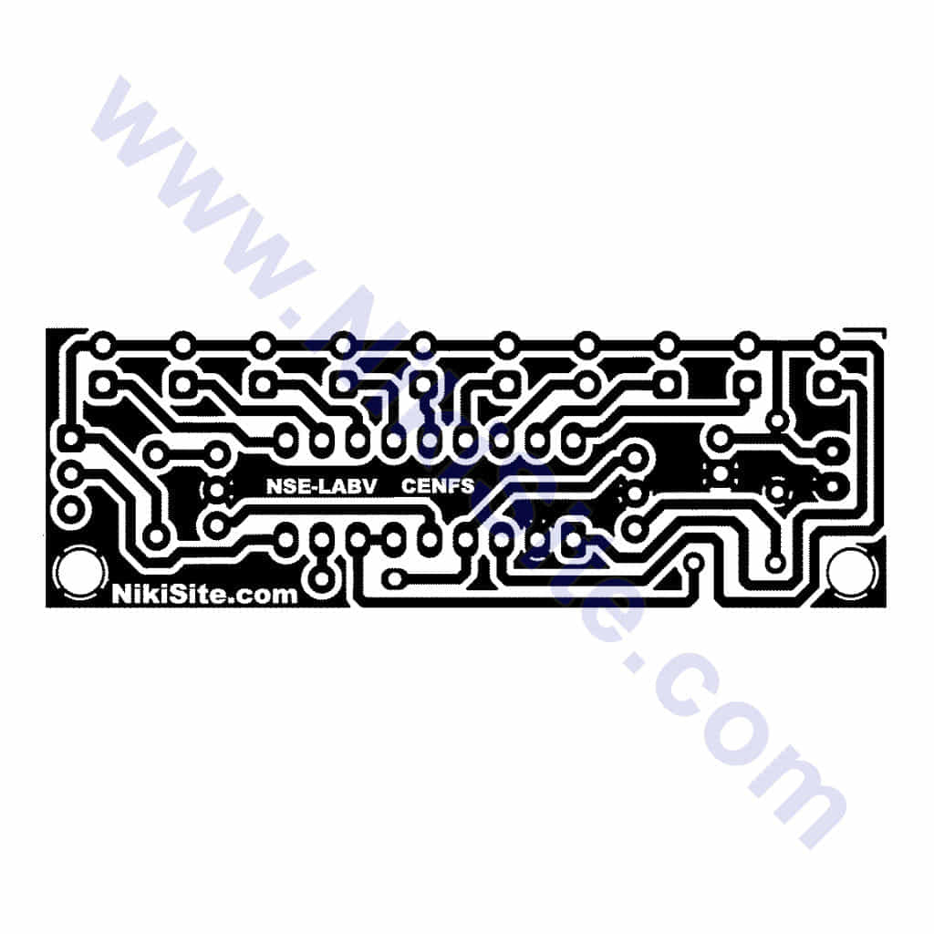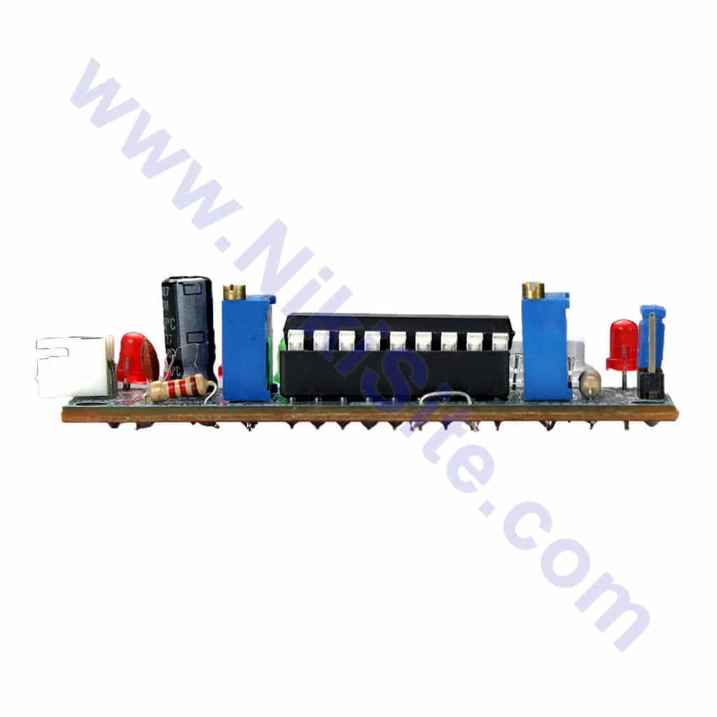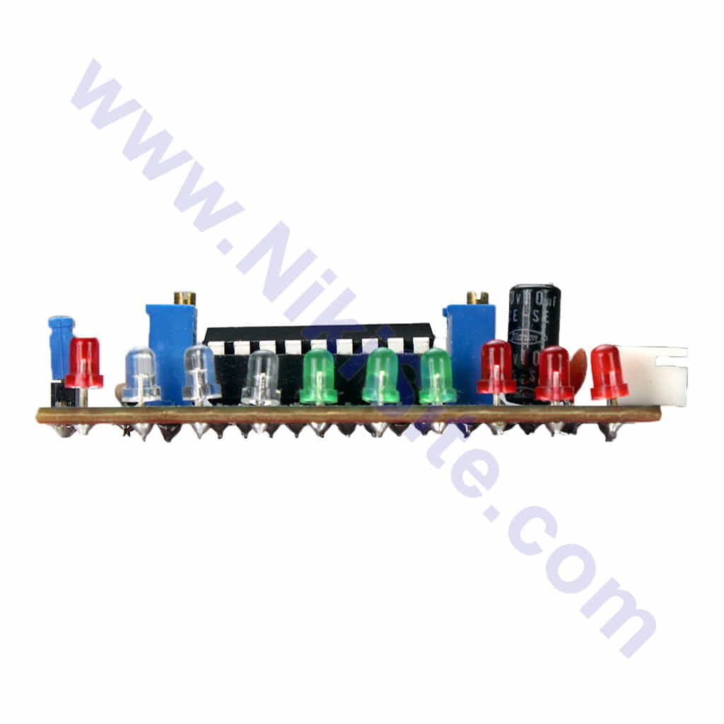 1. **تنظیم حداقل (PR1):** - باتری را به 10.5V تنظیم کنید - PR1 را بچرخانید تا LED 1 روشن شود - PR1 را تنظیم کنید تا LED 1 خاموش شود 2. **تنظیم حداکثر (PR2):** - باتری را به 15.0V تنظیم کنید - PR2 را بچرخانید تا LED 10 روشن شود - PR2 را تنظیم کنید تا LED 10 خاموش شود 3. **تست:** - ولتاژ را از 10.5V تا 15V تغییر دهید - LED ها باید به ترتیب روشن شوند